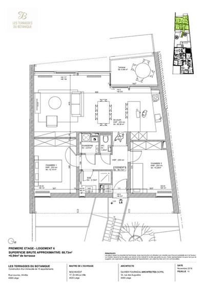 Situé au 1er étage du bâtiment arrière de la résidence Les Terrasses du Botanique, cet appartement de 88 m² comprend hall, living avec cuisine équipée ouverte, 2 chambres, wc, salle de bains, buanderie, terrasse de 7 m² orientée à l'ouest et une cave - emplacement de parking au sous-sol en option. Sa situation à l'arrière lui apporte calme et verdure. La qualité des finitions et des matériaux utilisés ainsi que l'architecture à la fois moderne, élégante et bien intégrée dans un quartier historique confèrent standing et personnalité aux différents appartements de la résidence. La proximité du jardin botanique, de la gare de Liège-Carré et des nombreux commerces de la rue Saint-Gilles et du centre ville en font un endroit de premier choix. ·Achat à 6 % de TVA possible pour habitant et investisseur!Général