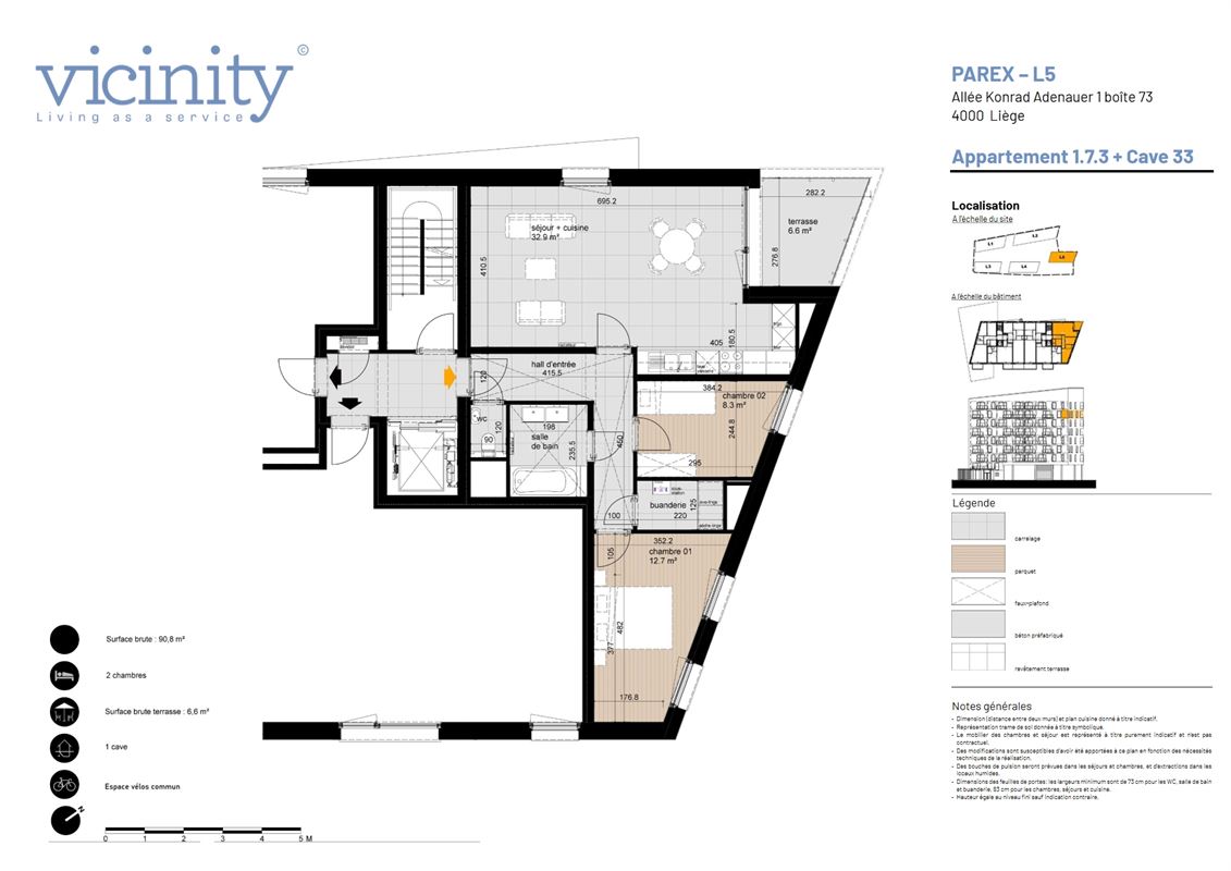 Loué !! Au coeur du quartier symbole du renouveau liégeois, jouxtant la gare internationale des Guillemins, ce magnifique appartement 2 chambres se trouve au 7ème étage du complexe Paradis Express. Bénéficiant d'une situation exceptionnelle à un jet de pierre de la gare, de toutes lignes de bus et du tram ; l'environnement immédiat propose également les superbes bords de Meuse et le cadre verdoyant du parc de la Boverie, ainsi que de nombreux commerces, écoles et toutes facilités. Le bien se compose d'un hall d'entrée avec WC indépendant, d'un séjour lumineux avec cuisine ouverte hyper équipée, d'une terrasse couverte, d'un hall de nuit, d'une buanderie, d'une salle de bain avec baignoire et de 2 chambres à coucher. Une cave privative complète l'offre. Un emplacement de parking est à disposition, sans obligation, pour 100 €/mois (+ 5 € de charges). Dans un immeuble achevé de construction en 2023, ce petit cocon dernier cri attend ses nouveaux occupants sans tarder ! Visites sur rendez-vous au 04 223 23 88. Loyer : 1.125 €/mois + Charges : 175 €/mois (communs & frais de gestion).Général